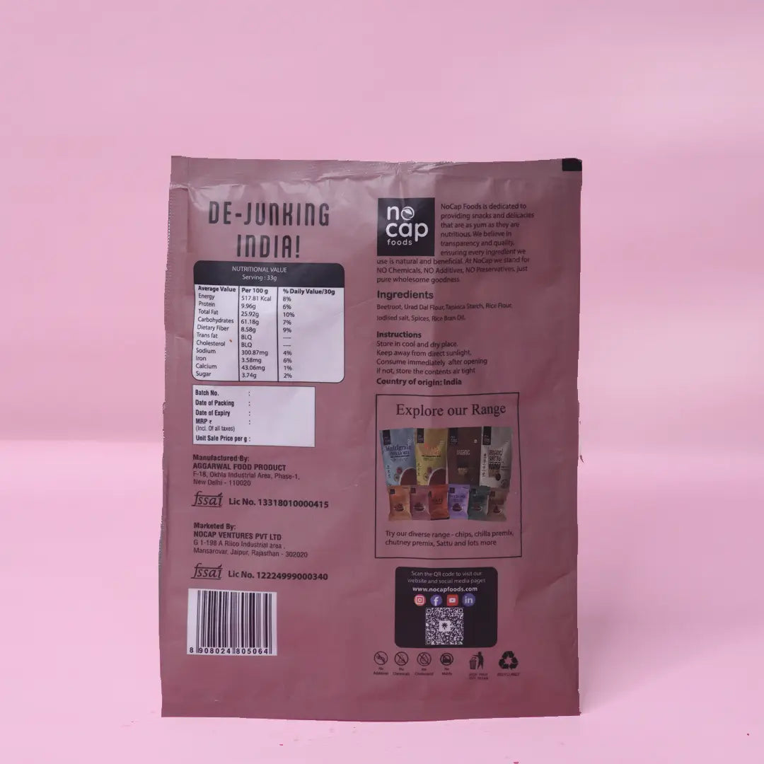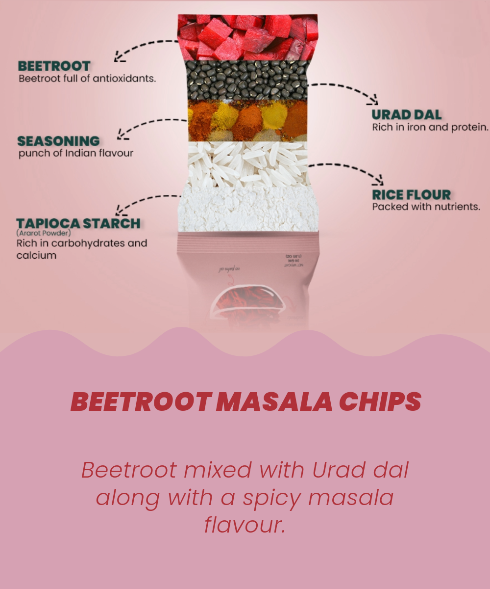 Experience the vibrant crunch of our Beetroot Masala Chips, a snack that combines a perfect blend of earthy spices with the bold taste of beetroot. Each chip offers a delightful crunch and a burst of flavor that will make your heart "beet" faster! Ideal for those seeking a healthy yet exciting snack, our Beetroot Masala Chips deliver a flavorful twist on traditional snacking. Enjoy a treat that satisfies your taste buds and supports your wellness, your cravings and your body will both be delighted!