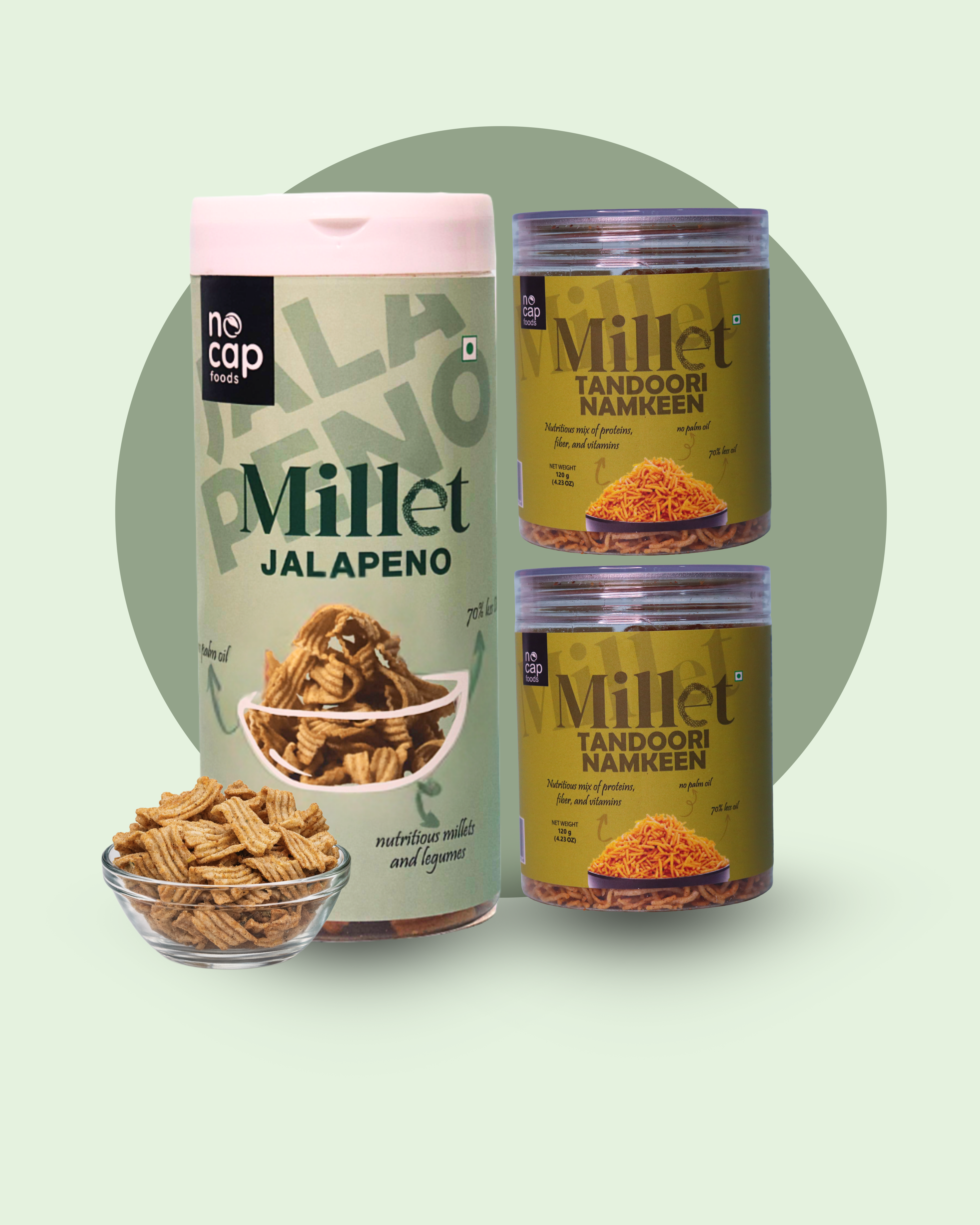 Our Millet Jalapeño Chips are designed for those who crave a spicy kick without compromising on health. Elevate your snack game with these fiery chips, packed with bold jalapeño flavour that delivers a satisfying heat with every bite. For a savory crunch, enjoy our Millet Tandoori Namkeen, a deliciously spiced snack that captures the essence of tandoori flavors.Made with a nutritious blend, they offer a crunchy, flavorful experience that will take your taste buds on a spicy adventure. Enjoy snacks that are both exciting and health-conscious!