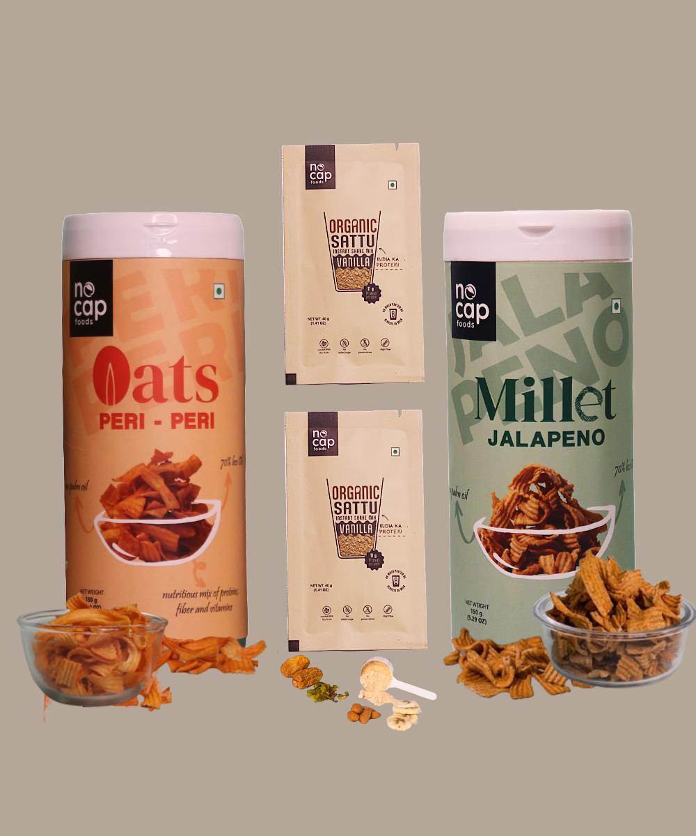 Elevate your snacking with our Ultimate Crunch Combo, featuring delicious chip flavours (150gm each) & Sattu 40gm. Crave heat? The Oats Peri-Peri Chips deliver a spicy kick combined with wholesome rolled oats. For a savory crunch, enjoy our Millet Jalapeno Chips, a deliciously spiced snack that captures the essence of zesty flavors. Pair it with the rich Sattu Vanilla Shake, combining the wholesome benefits of roasted gram flour with the bold flavors of coffee and hazelnut. This duo is perfect for a quick breakfast or a wholesome snack, keeping you energized and satisfied throughout the day!