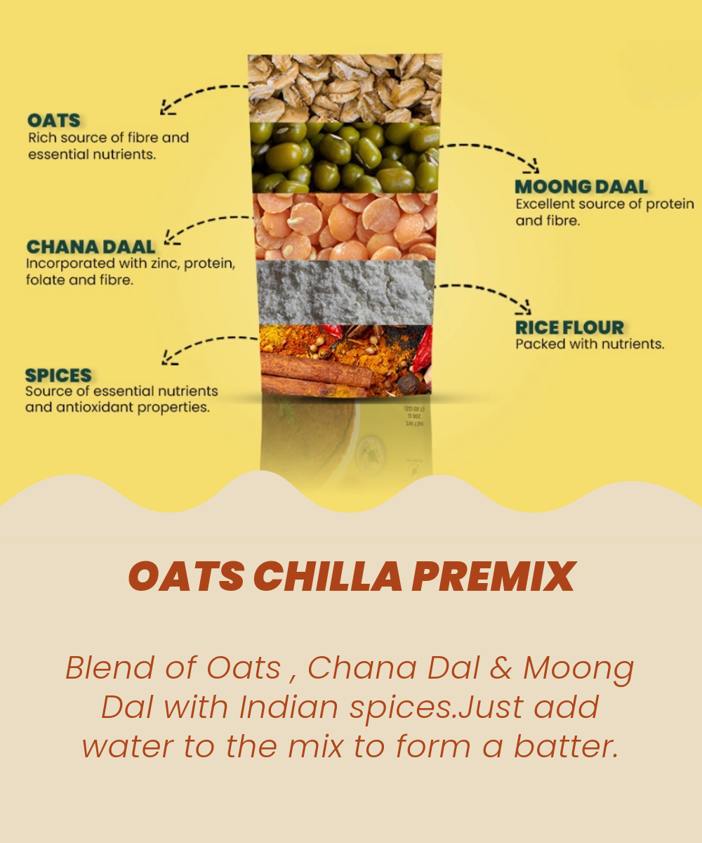 Revitalize your meals and snacks with our High Protein, Fiber-Rich Combo, featuring an enticing variety of nutritious products. Begin your day with our Oats Chilla Premix, a quick and healthy option loaded with flavor. Crunch into our Oats Peri Peri Chips, offering a savory blend of oats , urad dal and spices for a deliciously satisfying snack.Finally, enjoy the crispy Oats Namkeen, a wholesome snack that keeps your cravings in check. This combo strikes a perfect balance of nutrition and taste, ideal for any time of day!